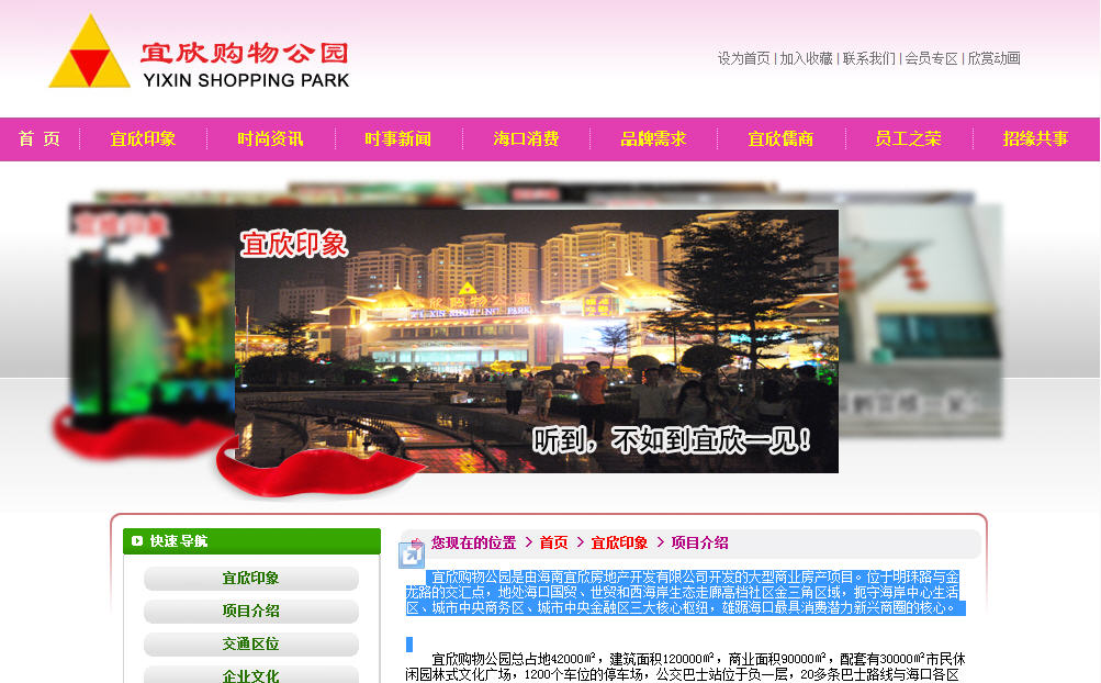 宜欣購物公園是由海南宜欣房地產(chǎn)開發(fā)有限公司開發(fā)的大型商業(yè)房產(chǎn)項(xiàng)目。位于明珠路與金龍路的交匯點(diǎn),地處海口國(guó)貿(mào)、世貿(mào)和西海岸生態(tài)走廊高檔社區(qū)金三角區(qū)域,扼守海岸中心生活區(qū)、城市中央商務(wù)區(qū)、城市中央金融區(qū)三大核心樞紐,雄踞海口最具消費(fèi)潛力新興商圈的核心。