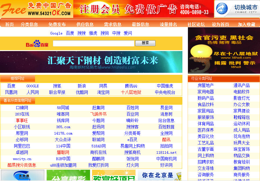 免費中國廣告網站致力于網絡信息分類模式的探索,開發,建立,創新,是融分類信息導航和分類信息為一體的大型綜合門戶網站,旨在為訪問者提供簡潔,精準,及時的分類信息導航服務和免費方便的分類信息發布平臺, 聯合業界同仁共同開發網絡資源...
