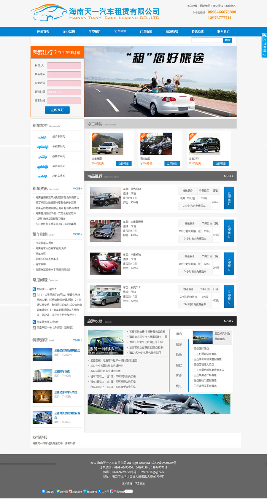 海南天一汽車租賃有限公司是經海南省交通廳審核批準,2007年在海南省工商行政管理局依法注冊的從事汽車租賃服務的專業企業。是正規、專業的汽車租賃服務公司,注冊資金100萬.公司主要對社會各界需要商務用車的個人、企事業單位、團體、賓館、商務公司、旅游公司等為服務對象。